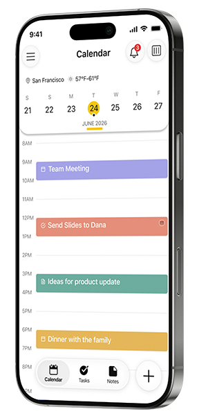 24me keeps all of your stuff in one place, and eliminates the need to switch between multiple apps to get a sense of your schedule. It holds together all your calendar events from your different calendars, your to-dos, and all of your notes. Tasks with due dates will appear on the calendar at the right time, so that you will have a holistic view of your schedule.